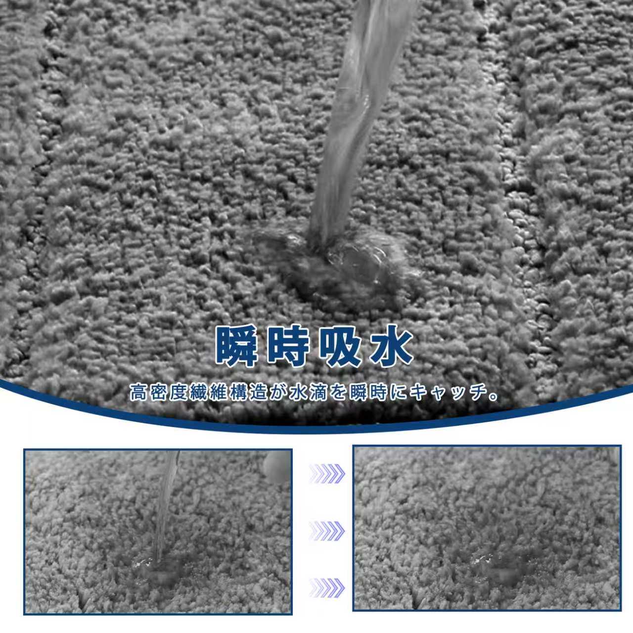 【瞬時吸水】高密度繊維構造が水滴を瞬時にキャッチ。濡れた足を乗せるだけで、あっという間に水分を吸い取ります。吸水スピードと速乾性を両立させ、常に清潔な状態を維持。足元も床面もサラサラの快適さが持続します。