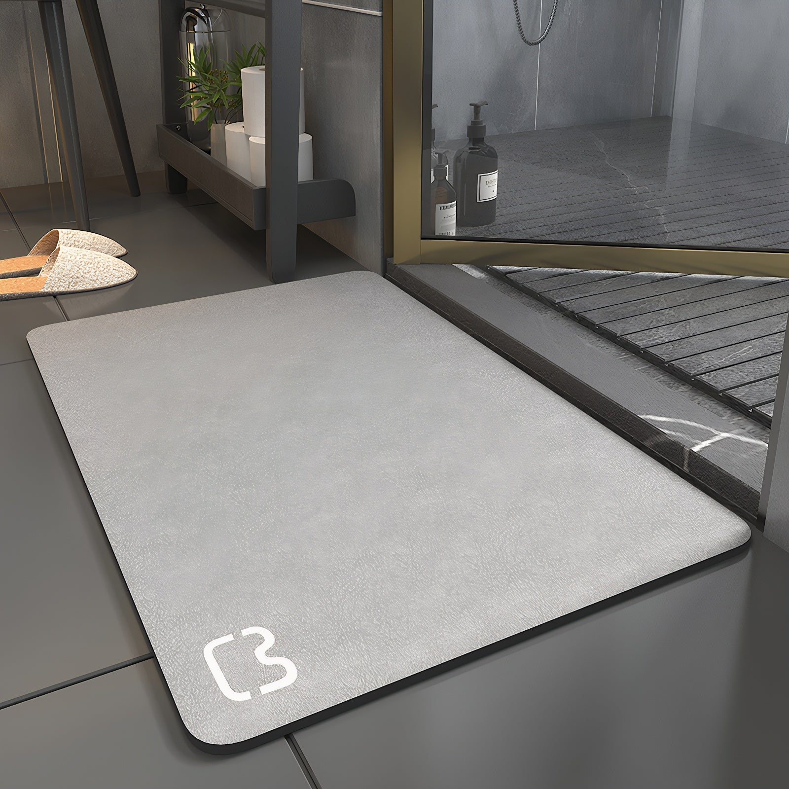 【高い吸水力と速乾性】硅藻土(けいそうど)は細孔が密集しているため、瞬時に水分を吸収し、素早く乾燥します。本品は硅藻泥を特殊配合することにより、従来品よりさらに優れた吸水性能と水切れの良さを実現。浴室やプールサイド、アウトドアなど、水周りでも高い効果を発揮します。