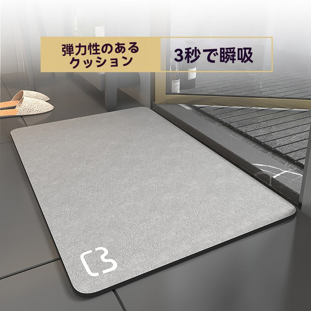 【4層吸水構造】当商品は4層構造により優れた機能を発揮します。表層はマイクロファイバーテクノロジーファブリック(高密度繊維で快適な踏み心地)、第二層は珪藻土透水層(多孔質構造で素早く吸水)、第三層は珪藻土ゴム吸水層(たっぷりと水分を保持)、最下層は滑り止めゴム加工(安全性を確保)となっており、抜群の吸水性与安定性を実現しました。